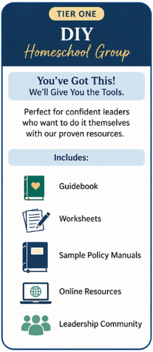 This is for the mom who is capable, motivated, and just needs the right tools in her hands. Tier One gives you a comprehensive guidebook, worksheets, sample policy manuals, online resources, and access to a leadership community of other homeschool group leaders who get it. You don't have to reinvent the wheel — we hand you the wheel, the blueprint, and a community cheering you on.